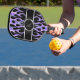 This custom pickleball paddle is black with purple flames and silver metallic accents. Personalised with your initial. Great gift!