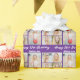 Customize your own cute purple birthday wrapping paper with a cute 5 photo collage. Add the person's name and year in white script above the five photographs for pretty personalized gifts.