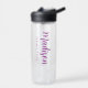 Custom clear water bottle featuring your first name displayed in a bold, purple script with your last name displayed in modern lettering below. The simple, personalised water bottle can also be used to display your organisation or business name.