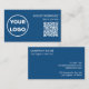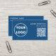 Look professional when you network with modern blue business cards featuring your logo, name, title, and a customisable QR code on the front. The back features your company name, contact information, and slogan or other text in white text on blue. Personalise the QR code with your website, portfolio, or landing page link and add your logo and text in the sidebar. Your logo can be any shape. White or light coloured logos will work best with the dark background.
