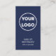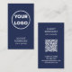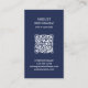 Look professional when you network with modern navy blue business cards featuring your logo, name, and title on the front, and a customisable QR code and your contact information on the back. Personalise the QR code with your website, portfolio, or landing page link and add your logo and text in the sidebar. Your logo can be any shape. Tap "Edit using Design Tool" for more options.