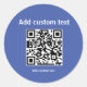 Custom Qr code blue sticker label for customers, url, website promotion, packaging. Promotion sticker label, marketing signs for your website, commercial offers, mailing, company products, business service, landing page, events, products packaging. Simple blue design packaging sticker. Upload your QR code, add your text for your personalized sticker. Business simple round sticker ( QR code autocollant)