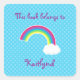 A bright rainbow with a cloud on one end, is on a teal blue background with light polka dots. Personalise it with your child's name.