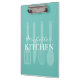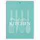 Custom recipe clipboard with cooking utensil print. Double side print with personalised name or monogram letters. Elegant turquoise blue design with knife, whisk, spoon and spatula. Handy kitchen accessories for him or her. Trendy personal gift ideas for Birthday, bridal shower, wedding, Mother's day and more. Elegant script typography template. Unique presents for chef cook, mum, wife, girlfriend, friend, family, etc. Also nice for restaurant, cafe, bar, etc.