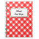 A custom recipe notebook with retro script letters on a faux doily and a diagonal red and white plaid pattern with overlapping thick and thin stripes.