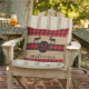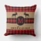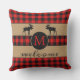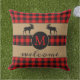 Fun and cute outdoor throw pillow with Welcome greeting on a classic black and red chequered plaid pattern on burlap background. Stylish rustic unique design with room to customise or personalise with your family name monogram. Original personalised monogrammed outdoor decor accent for decorating the front porch or yard of your country cottage house, log cabin, mountain lodge, fishing camp, lake or river vacation home.