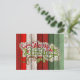 Beautiful, unique, classic, trendy, pretty and decorative Christmas holiday greeting card with a classic Holiday dark red, forest green, and white coloured 'Merry Christmas' quote text on a rustic weathered wooden country cottage farmhouse style planks pattern background.