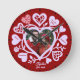 This vibrant wall clock is special because it transforms a standard timepiece into a cherished romantic keepsake by featuring your favourite couple's photo at the heart of the design. Set against a bold crimson background with soft pink decorative hearts and customisable names, it tells a unique story of love and passion. It is a perfect gift for anniversaries, weddings, or Valentine's Day, offering a deeply personal and striking touch to any home.