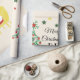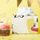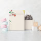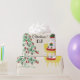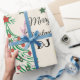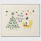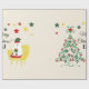 This lovely cute little bear is sitting on a chair, wearing his Christmas hat. He happily holds a gift box and stands next to a Christmas tree decorated with Christmas ornaments and colourful stars. Personalise this Christmas wrapping paper with your initials or name.