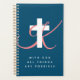 Custom religious cross monogram cross spiral wedding planner. Create your own calendar agenda. Elegant Christian faith logo icon design with monogrammed initial letter. Religious gift idea for friends, family, sister, mum, grandma, grandmother, wife, daughter, teacher, wedding planner, guests, couple, bride and groom, boss, co worker, coach, church pastor, priest, deacon, ministry, Catholic, Baptist, Lutheran, Evangelical, Methodist, Protestant etc. Monogrammed Christianity symbol with spiritual quote, inspirational scripture, Jesus sayings or custom bible verse. Personalised presents for him and her. Also nice for First Holy Communion, remembrance, ordination, commemoration etc. Custom school and office supplies. With God All Things Are Possible. Coral pink and cerulean blue colour combination with gold spiral.