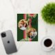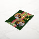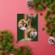 Contemporary classic Christmas holiday season greeting card with light and dark green, pink and red coloured abstract pattern with real gold foil JOYFUL wish text. With room to customise or personalise with two photos and family name (or individual names) on the front, and a customisable season greeting message on the backside of the card.
