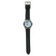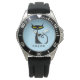 This personalised stainless steel black rubber watch design features a retro mid century modern "atomic" black cat with big yellow eyes and a curly tail.