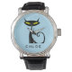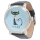 This personalised wristwatch design features a retro mid century modern "atomic" black cat with big yellow eyes and a curly tail.