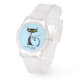 This personalised silicone strap clear watch design features a retro mid century modern "atomic" black cat with big yellow eyes and a curly tail.