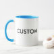 Custom Ringer 11oz Ceramic Mug - LIGHT BLUE Lip & Handle, 3.8” high x 3.2” diameter. 11 oz or 15 oz options. Microwave and dishwasher safe. FDA food and beverage safety approved. Black, maroon, hunter green, light blue, lime, navy blue, orange, pink, yellow, and red colour options.