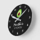 Custom round kitchen wall clock with green avocado logo. Healthy food design with modern typography template. Add your own name, monogram or funny quote / saying. Cute gift idea for dietician, nutritionist, new home, restaurant, cafe, diner, dinner party etc. Personalised home decor ideas and decorations.