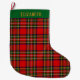 Christmas stocking features a personalized design with the Royal Stewart tartan plaid Scottish pattern - traditional tartan with modern colors and custom script family member name text.