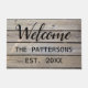 A perfect cute and custom rustic wood look doormat for your family. "Welcome!" (in a modern script), your family name and "EST." plus the year established are printed against a photo of warm wood slats. Perfect for your farmhouse, country style house, beach house, boathouse or any house!