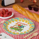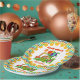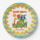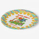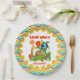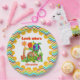 Kids turning three years old who love animals, especially safari or zoo animals will love these colourful safari theme birthday paper plates that feature jungle plants and trees, a giraffe, lion, birthday balloons, sun, text that reads Look Who's 3, a border of blue, green, orange, brown, and white chevron stripes, and a yellow decorative ring! You can easily add your child's name to personalise these safari 3rd birthday paper plates!