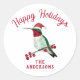 Cute customisable Happy Holidays sticker featuring a ruby-throated hummingbird wearing a Santa hat on a white background. Just add your name!