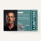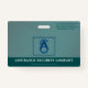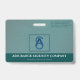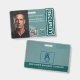 Custom teal photo ID badge template designed for security officers, event staff, and company employees. Features space for photo, name, ID number, expiration date, QR code, and company logo. Bold teal background with modern security panel for a professional and trustworthy look.