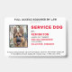 Service Dog - Easily identify your dog as a working service dog, while keeping your dog focused and cut down on distractions while working with one of these k9 service dog id badges. Although not required, a Service Dog ID badge gives you and your service dog peace of mind and ease of travel without hassles and questions when seeking public access. Our Service Dog Id Badges are TSA compliant and have the United States Federal Laws on the back with ADA website and contact phone number. Customise with your Service Dog’s photo, name, handler’s name and city and state.