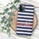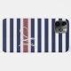 Contemporary dark midnight blue and white stripes pattern. With a banner to customise or personalise with the monogram of your choice. Beautiful, modern, and cool cover for the trend-savvy and art-loving hip trendsetter, artsy motif lover who wants to protect their phone from dust and dirt, wear and tear. This design is available in Apple iPhone 6, 7, and 8 Plus, 10 or X, XR, XS, 11, 12, 13 Mini, 14, 15 Plus, and Pro Max cellphone cases. Show off your style, look fashionable trendy, and feel stylish with a unique design on a mobile device accessory of your choice.