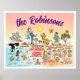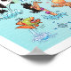 Bright and colourful scene offers a spectacular view of Southern California - wacky characters frolic on the beach and desert of SoCal showcasing Los Angeles, Orange County, San Diego, Santa Barbara, Riverside, Palm Springs, El Centro, Anza Borrego and Joshua Tree parks as well as the border cities of Tijuana, Tecate and Mexicali. This charming scene has it all – a surfer hangs ten while a killer whale leaps out of the water, zoo animals greet the tourists, wine lovers make a toast as a T-Rex roars a challenge and a hiker is noticed by a UFO and much more…