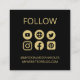 Design for an entrepreneur, content creator, influencer, blogger, retailer, café and any small business. This piece is a call to action for viewers, clients, customers to interact with the small business, personality or influencer on their social media platforms. While there are 6 social media entities listed, any of these that you do not use can easily be removed if required to personalise this design to your company or organisation. This design is on a black background with the text and social media icons all in a gold colour for an elegant and sophisticated design. The social platform icons are for YouTube, Twitter, Instagram, Facebook Meta, Pinterest, and a website - either for the company, a blog, or merch sales. On the front there is space for you to put in your own logo or avatar.