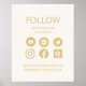 Design for an entrepreneur, content creator, influencer, blogger, retailer, café and any small business. This piece is a call to action for viewers, clients, customers to interact with the small business, personality or influencer on their social media platforms. While there are 6 social media entities listed, any of these that you do not use can easily be removed if required to personalise this design to your company or organisation. It would be great on the wall of a reception area, on the wall of a cafe, or behind an influencer during videos who wants to encourage greater engagement with their community and clients. This design has a cream background to really stand out, but with the text and social media icons all in a gold colour for an elegant and sophisticated design. The social platform icons are for YouTube, Twitter, Instagram, Facebook Meta, Pinterest, and a website - either for the company, a blog, or merch sales.