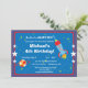 This fun birthday party invitation features a rocket ship blasting off and a polka dot planet on a blue outer space background with stars. Completely customisable.