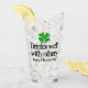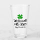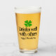 Custom St Patricks Day party beer glass with green shamrock logo. Fun drinking gift idea for Irish friends, family, dad, husband, brother, father, grandpa, uncle, friend, coworker, boss, colleague, coach etc. Also nice for Birthday, pub, cafe, bar, restaurant, wedding etc. Add your own funny quote or saying like ; Drinks well with others. Humourous Irish pride design with vintage lucky 4 leaf clover icon. Sláinte cheers!