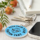 Custom swimming team round acrylic keychain for swimmers. Add your own personalised text. Modern design with swim goggles logo or custom icon. Blue pool colour background.