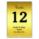 Personalised wedding table card with template text for a number, names and date; golden and yellow retro design with bokeh circles texture;