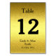 Personalised wedding table card with template text for a number, names and date; golden and yellow retro design with bokeh circles texture;