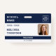 A horizontal modern minimalist personalised teacher ID badge with school logo, photo and details. Personalise with your logo, photo and details to create your own unique elegant white business badge.
