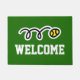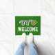 Custom tennis ball design welcome doormat. Make your own custom monogrammed indoor / outdoor door mat with custom background colour and text. Add your own welcome message, family name, surname, initial letter or funny quote. Fun gift idea for new club, home / housewarming, store, shop, company office, business etc. Modern sport typography with crossed tennis rackets. Personalizable template. Create your own classy entry mat / rug for front door / entryway or hall. Customisable home decor / decorations for your house. Gift ideas for tennis player, fan, coach etc. Green or custom colour background.