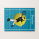 Fun custom tennis jigsaw puzzle featuring a bold blue court, bright yellow ball, and illustrated player in action. Personalise with a name to create a unique gift for tennis lovers, kids, or sports enthusiasts. Great for birthdays, team celebrations, or as a keepsake for players and coaches. Perfect for puzzle fans who enjoy sports-themed challenges, available in multiple sizes and piece counts to suit all ages.