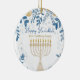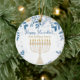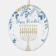 This delightful Hanukkah ceramic circle ornament, named “Hanukkah Harmony Ornament,” is a perfect addition to your holiday decor. It features a beautifully crafted menorah with glowing candles, set against a deep blue background adorned with intricate patterns of leaves and coins in shades of blue and gold. The elegant script “Happy Hanukkah” at the top adds a festive touch, while the customisable text below, such as “From [your name] Family,” allows you to personalise it with your own message. This ornament is not just a decoration but a meaningful keepsake that captures the spirit of Hanukkah.
