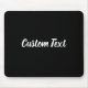 This black mouse pad has text in white script. The text can be edited to show a custom message or deleted