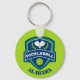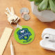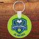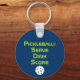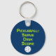 Customisable text. Bright green, navy blue and dark green pickleball with two white crossed pickleball paddles and lime green pickle ball. Back: navy blue background with custom text: Pickleball - serve, dink, score