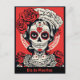 The postcard features a striking black background that sets the stage for the vibrant and eye-catching artwork at its centre. In the foreground, a vivid red and white pop art rendition of La Calavera Catrina takes centre stage. The iconic skull figure is adorned with intricate details, with the contrast of red and white hues creating a mesmerising visual impact. The use of bold lines and exaggerated features pays homage to the pop art style, infusing a contemporary twist into the traditional Día de Muertos motif. The skull's face is embellished with delicate swirls, intricate patterns, and captivating flourishes, reflecting the celebratory and artistic spirit of the holiday.