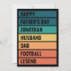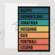 Celebrate Father’s Day with a bold and personalised greeting card designed especially for football-loving dads. This retro-style card features a customisable name and vibrant colour blocks with the words “Husband, Dad, Football Legend,” making it the perfect tribute to the important roles he plays. Ideal for husbands, fathers, stepdads, or father figures who are passionate about football, this unique design blends a vintage aesthetic with a modern message of appreciation. Personalise the text to create a one-of-a-kind card that shows your love and admiration. Whether you're shopping for a sports fan, family man, or both, this customisable Father’s Day card is a meaningful way to celebrate his special day.