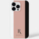 Beautiful elegant minimal custom phone case design featuring a colour block of three (rose gold, black, white) in pastel rose gold pale hues and personalised name and monogram in sophisticated typographic fonts.