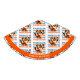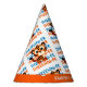 Personalised name threenager birthday party paper hat with a tiger to celebrate a little boy's 3rd birthday. Modern design with orange and blue colours for a kid's party.