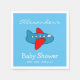 Personalised baby shower napkins with cute toy aeroplane. Colourful airliner plane design with date of birth or celebration. Adorable kids aviation theme aircraft illustration. Create your own fancy babyshower napkins with customisable text. In pastel light pink purple yellow blue grey etc. Cute idea for new mum, mother to be. Also fun for childrens 1st Birthday party.
