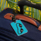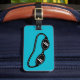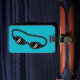 Custom travel luggage tag with swimming goggles design. Original gift idea for swimmer. Personalised baggage labels for suitcase or bag. Add your own name, monogram, funny quote and address on the back. Sports Birthday party gift idea for team coach, trainer, son, brother, dad, father, mum, sister, grandson, friend, cousin, fan, boy, girl etc. Suitable for adults and kids. Customisable blue background colour. Includes leather strap. Also available with slot for business card.