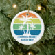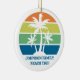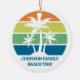 These cool personalised tropical beach sunset family Christmas ornaments feature 3 palm trees silhouetted against an orange and blue sky accented with yellow and green at the coast. Customise these family trip keepsake gifts with a coastal photo on the back from your spring break or summer or ocean cruise vacation.
