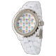 Custom tropical pineapple fruit pattern women's watch. Luxury gift idea for women and girls. Personalizable with her name. Elegant script typography template for name, monogram or quote. Make your own unique one of kind luxurious time piece. Stylish design with fruity background image and dial numbers. Classy present for Birthday, Christmas Holidays, Sweet 16, graduation, wedding etc. Buy for wife, girlfriend, sister, mother, mum, friend, cousin, aunt, grandma, daughter etc. Chic ladies accessories with exotic rainbow icon print.