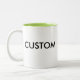 Custom Two-Tone 11oz Ceramic Mug - LIME GREEN Inside, 4.8” high x 3.2” diameter. 11 oz or 15 oz options. Microwave and dishwasher safe. FDA food and beverage safety approved. Black, lime, maroon, navy blue, orange, pink, red, yellow, hunter green, and light blue colour options.